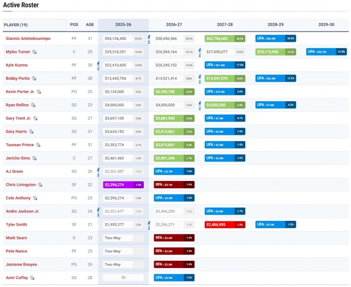 ESPN薪资专家Bobby Marks指出,目前雄鹿大名单已处于满额状态,包含15份保障合约及3份双向合同(科菲为训练营合约)。若要以保障合同正式签下萨纳西斯,球队需首先腾出一个球员名额。