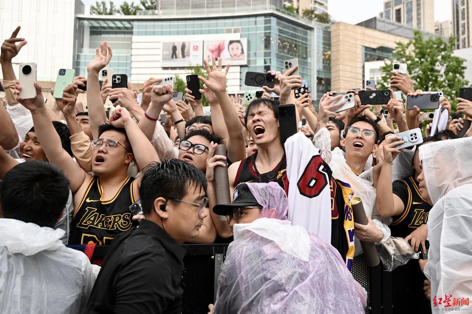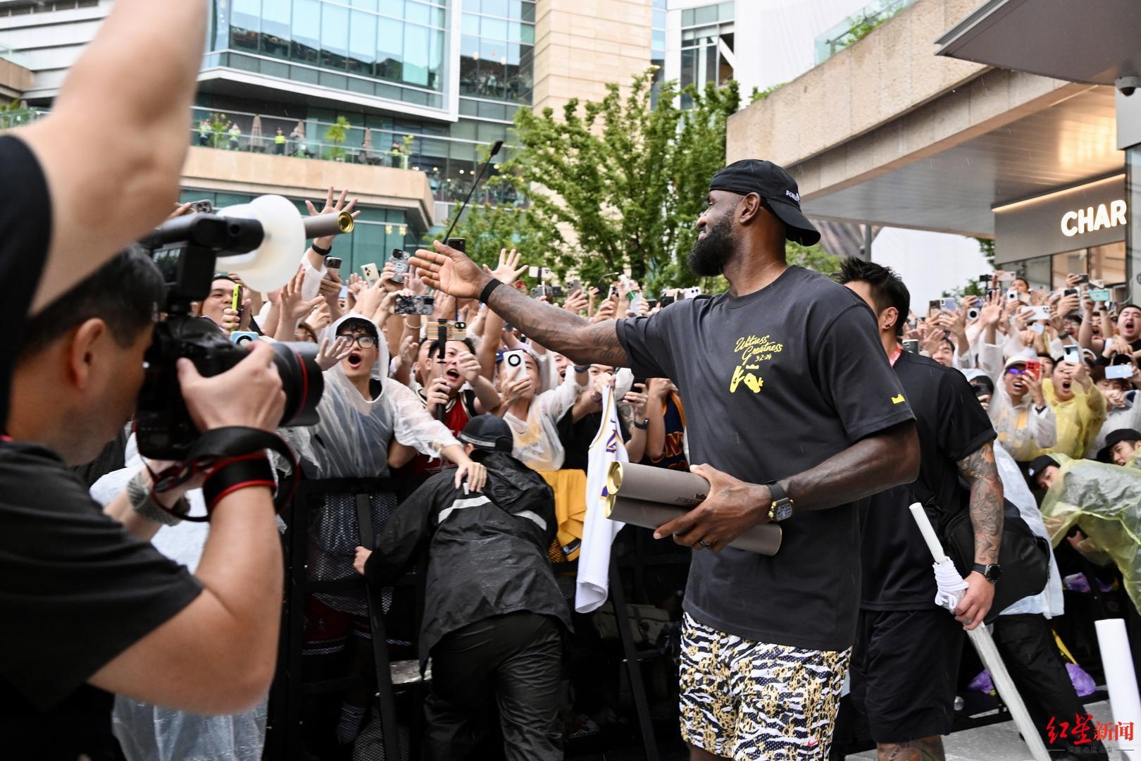由于接下来詹姆斯还有多项行程安排,所以与外场球迷们的见面只持续了几分钟,但也让大家感觉不虚此行。尤其让球迷们感动的是,詹姆斯看到大家在雨天还来到现场支持他,他在台上也扔掉了手中的透明雨伞,选择和球迷们一起淋雨。