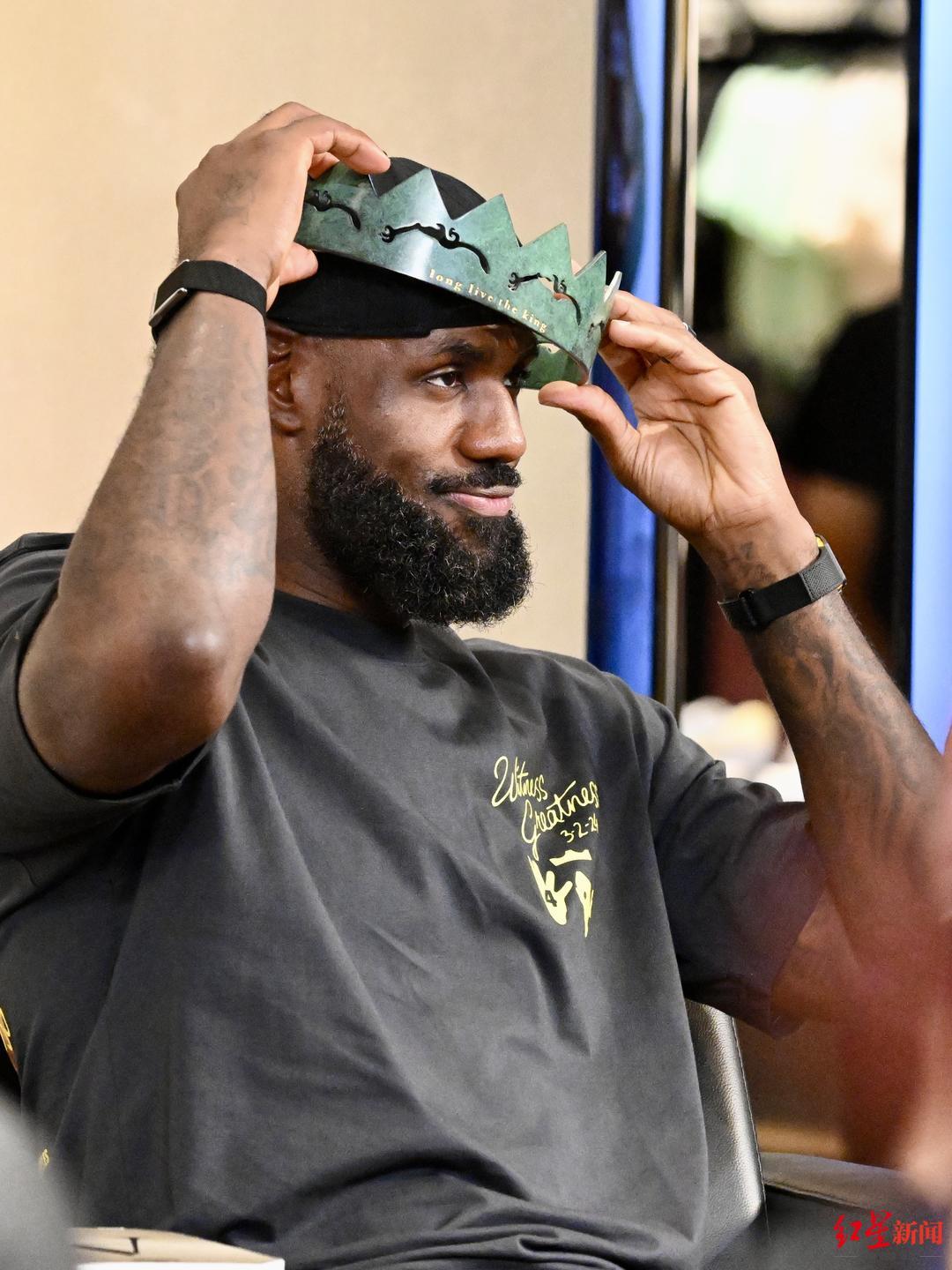在门店内的粉丝见面会上,还有成都球迷送给詹姆斯一顶“青铜皇冠”,上面有成都城市形象标识太阳神鸟的图案。詹姆斯接过皇冠,饶有兴趣地打量一番后,将其戴在了自己的头顶,这也契合了本次活动的主题“Forever King”(永远的国王)——在詹姆斯的球迷心目中,这位NBA巨星用篮球天赋和坚韧不屈的精神,从被寄予厚望到最终成为篮球场上的永恒国王!